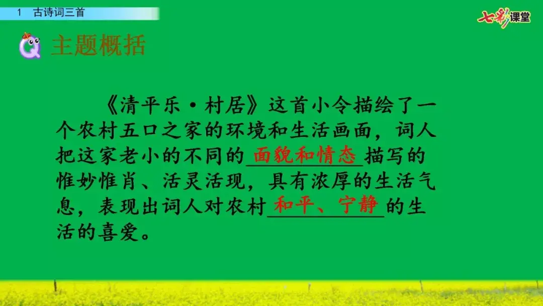 《清平乐·村居》这首小令描绘了农村一个五口之家的生活画面,词人把这家老小的不同的面貌和情态描写的惟妙惟肖、活灵活现,具有浓厚的生活气息,表现人情之美和生活之趣,表达出作者对农村宁静安逸生活的喜爱之情。