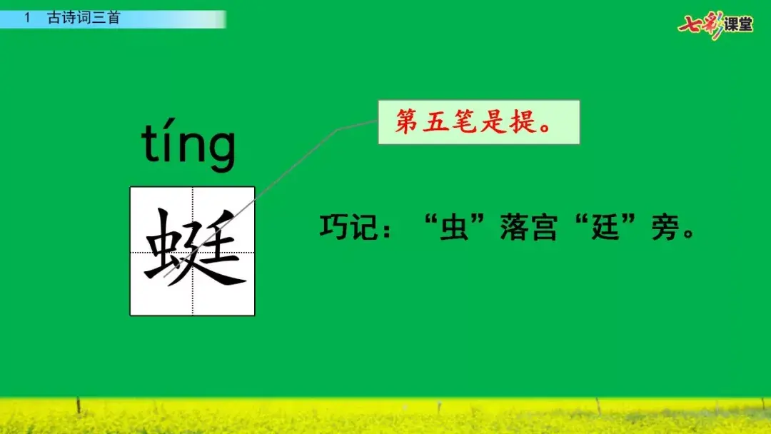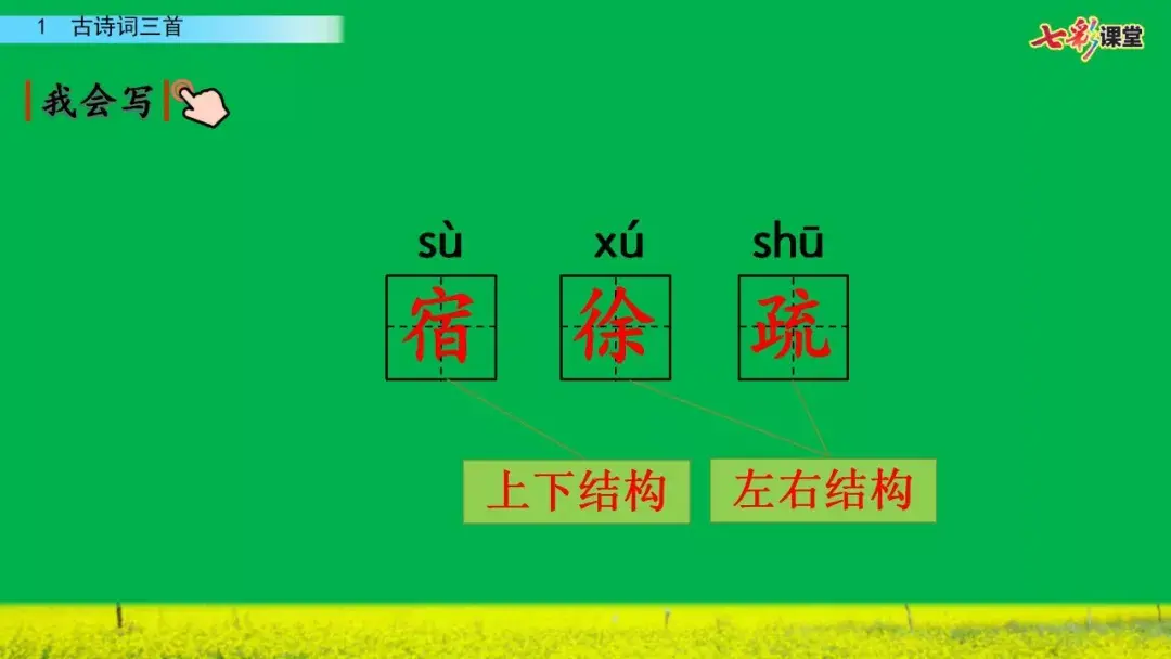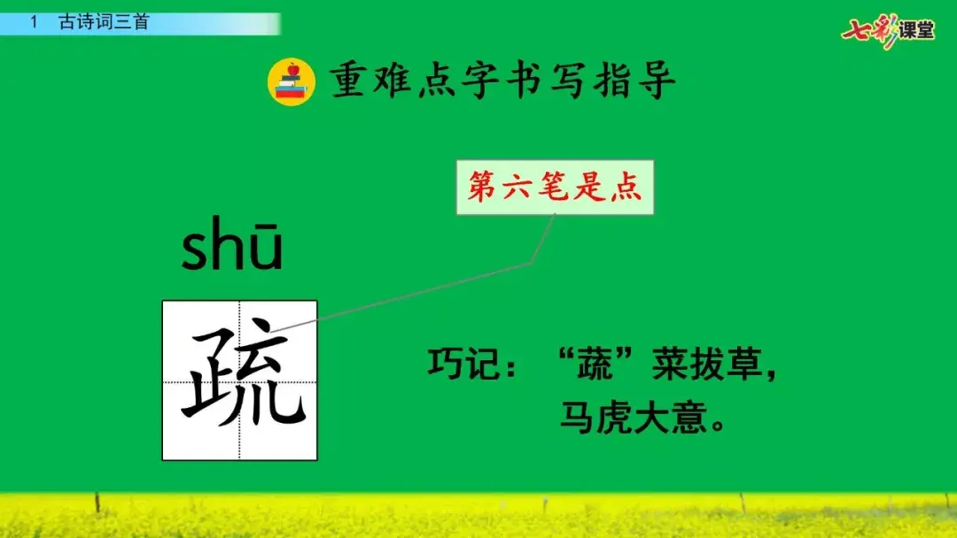 疏(疏远)蔬(蔬菜) 蜻(蜻蜓)晴(晴朗)