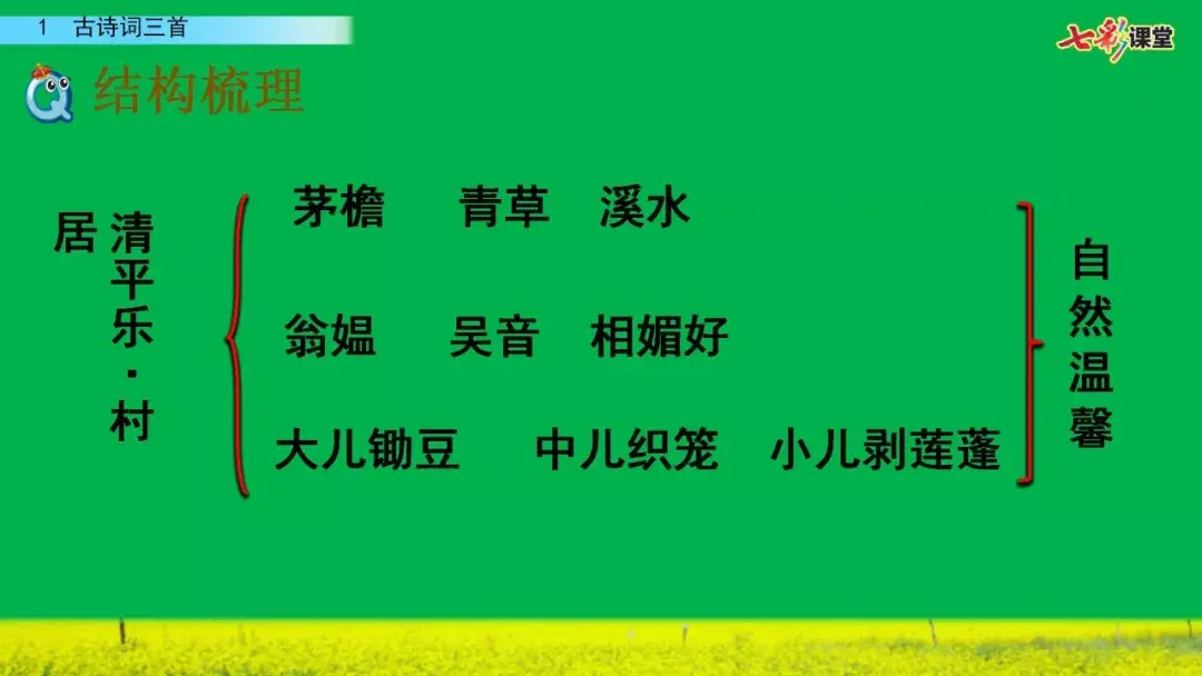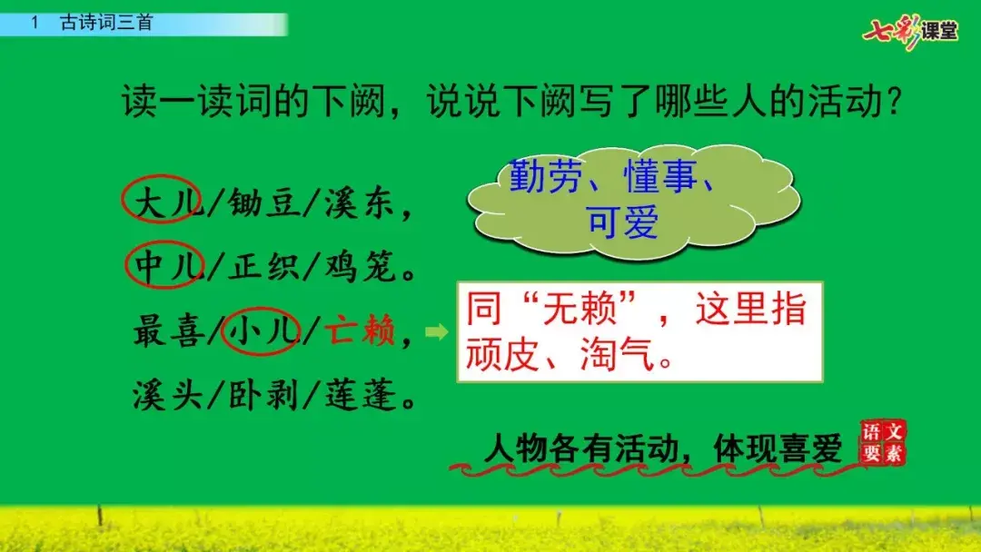 ②下片刻画了锄豆的大儿子、编鸡笼的二儿子、剥莲蓬的小儿子。重点刻画了小儿子。“喜”和“卧”用得好。“喜”字可以说是这首词的点睛之笔。小儿子的顽皮和淘气,为这幅乡村图增添了更为祥和更为温馨的气氛,使它霎时有了生机,有了光彩。“卧” 字使用得最妙,它把小儿子躺在溪边剥莲蓬时的天真、活泼、顽皮、可爱的样子和盘托出,从而使人物形象鲜明,意境耐人寻味。
