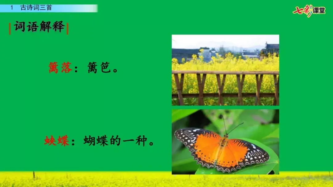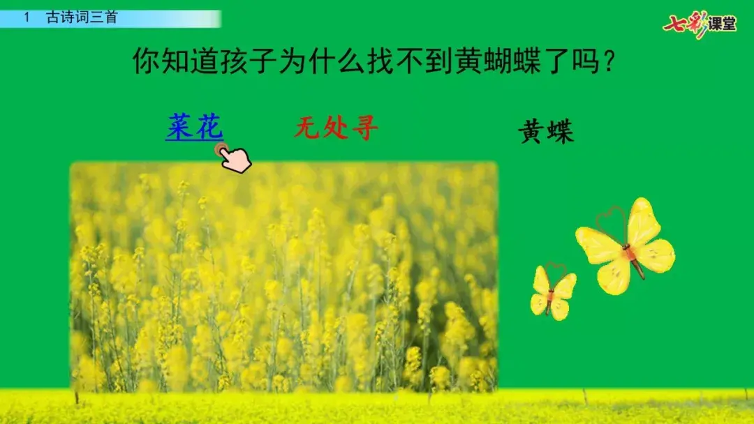 诗意:儿童们奔跑着,追寻翩翩飞舞的黄色蝴蝶。可是黄色蝴蝶飞入一片金灿灿的黄色菜花中,再也找不到了。