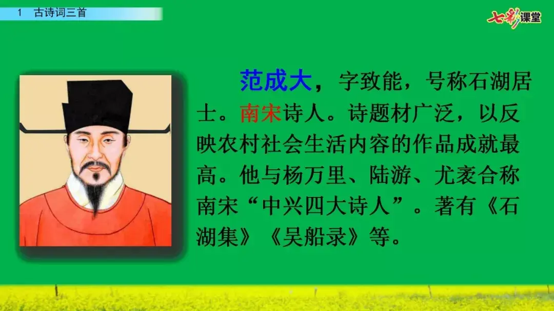 范成大,字至能,号称石湖居士。南宋诗人。诗题材广泛,以反映农村社会生活内容的作品成就最高。他与杨万里、陆游、尤袤合称南宋“中兴四大诗人”。著有《石湖集》《吴船录》等。 主要作品:《夏日田园杂兴》《喜晴》《卖痴呆词》等。