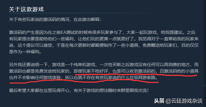 嗯,“即使玩家不给好评,也是可以收到激活码的”,这句话当中的“也”字那用的是真的惊天地、泣鬼神般神髓,一句话就直接承认了“steam好评就给激活码”这件事的确是真的。可见游戏开发商虽然存在破坏平台公平竞争的可能,但是至少还算是诚实的。