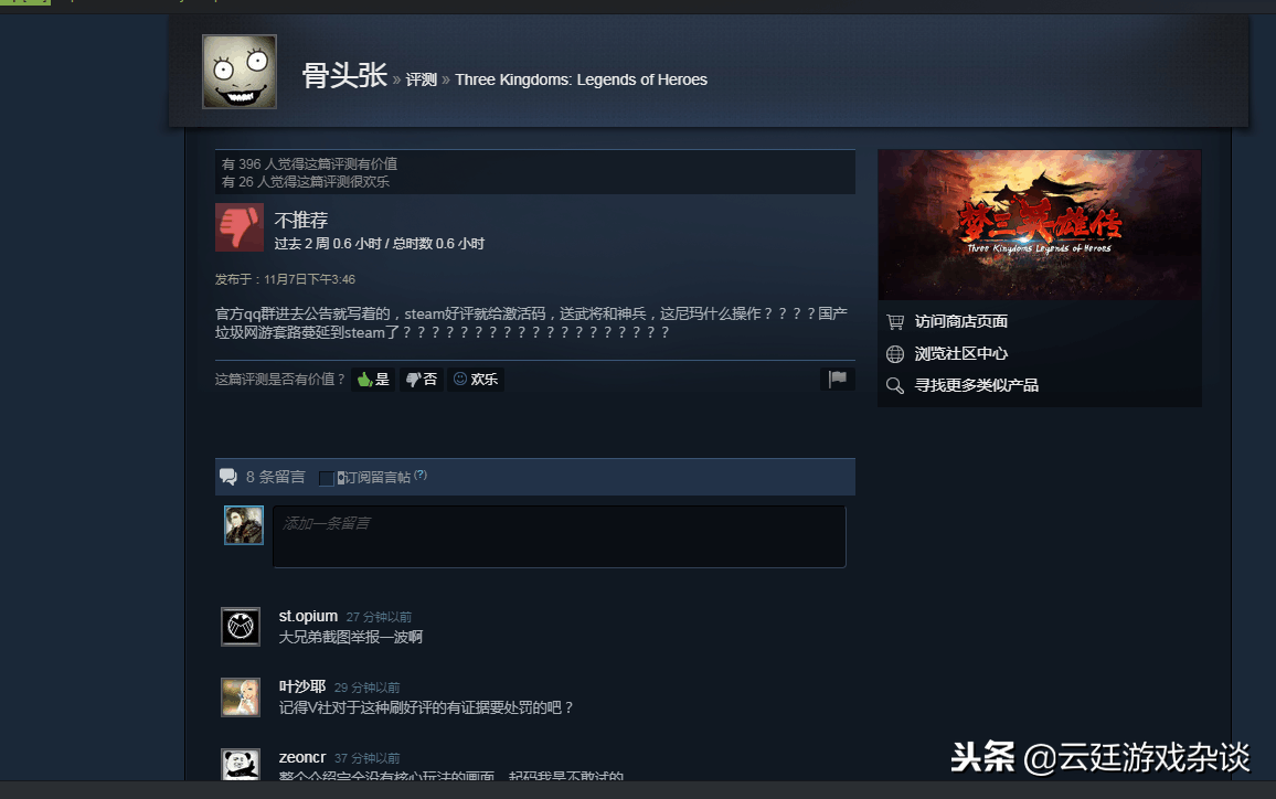 这是来自一位玩家的愤怒:“官方qq群进去公告就写着的,steam好评就给激活码,送武将和神兵,这尼玛什么操作????国产垃圾网游套路蔓延到steam了???????????????????”