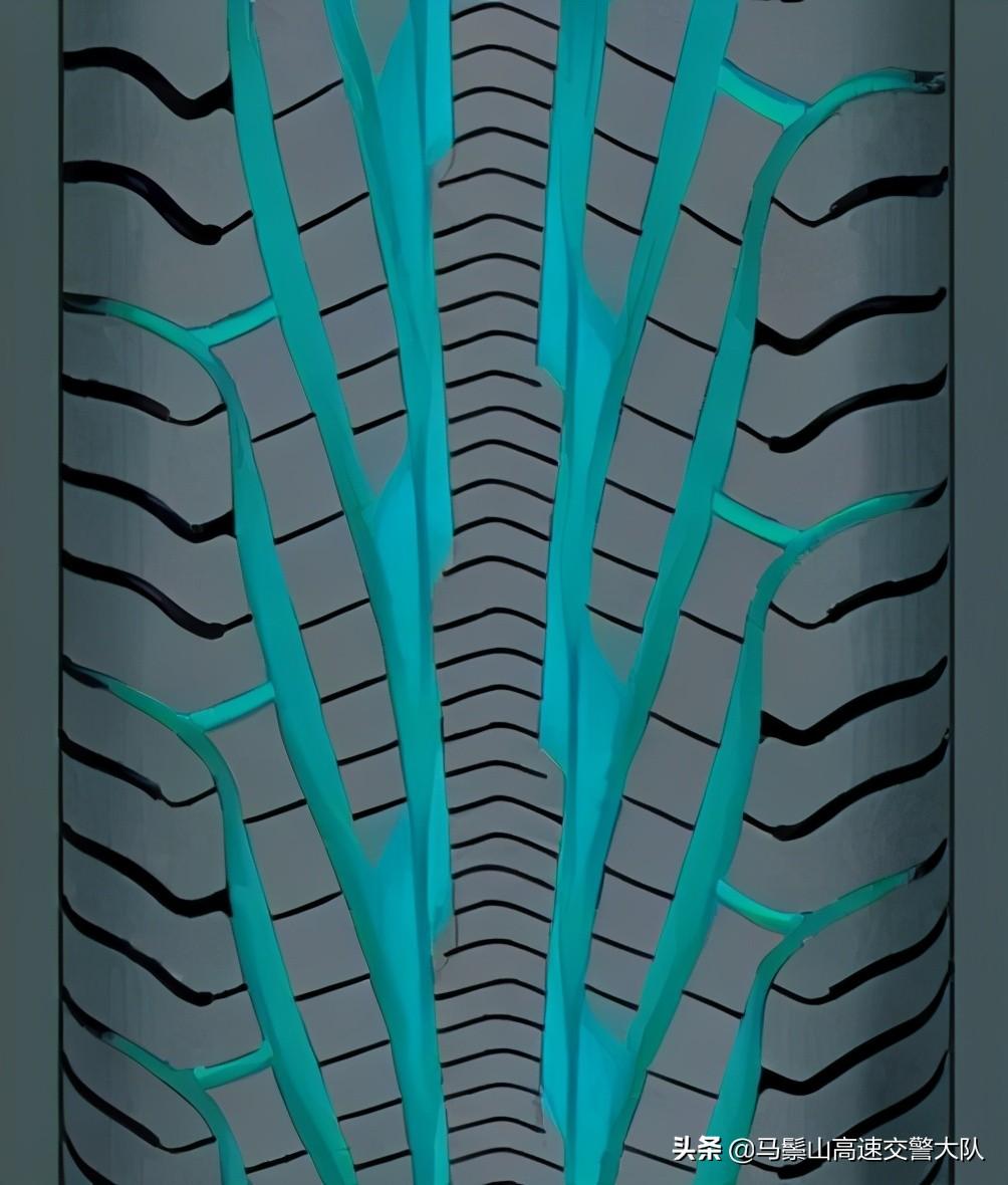 轮胎胎面还有一个安全块,一般轮胎花纹高于安全块1.6MM就需要更换轮胎了,看上面的轮胎,花纹和安全块已经在一个平面了,所以这样的轮胎是极其危险的。