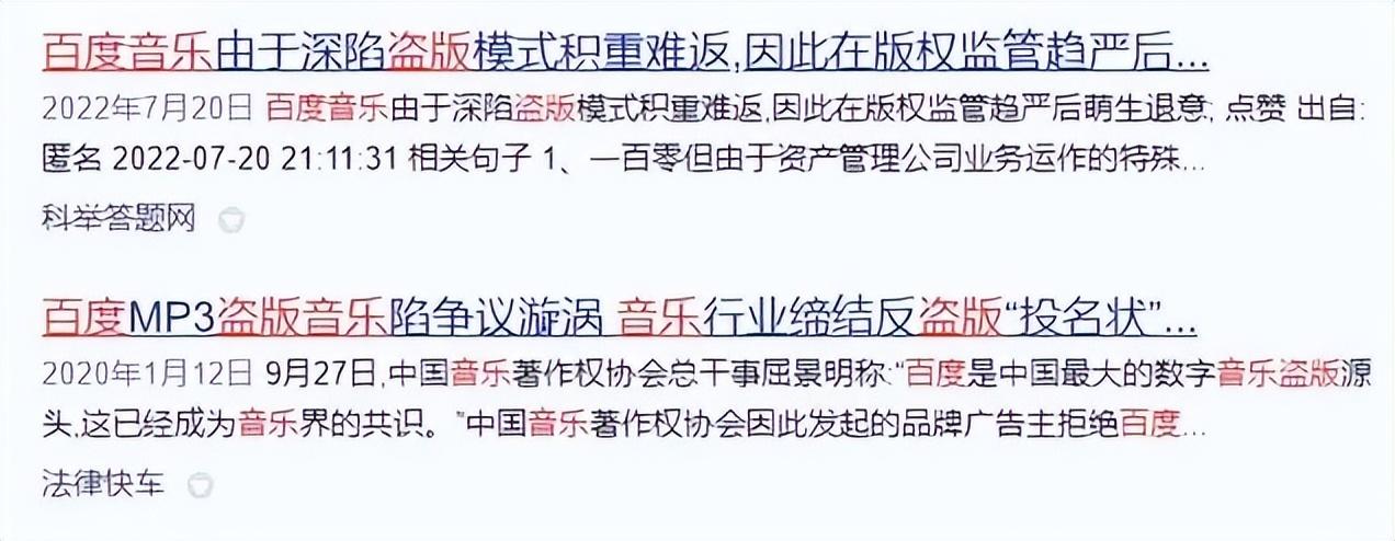 首先是版权的风险。 传统互联网时代的音乐平台,版权意识都称不上强。 像是早期的百度音乐,为了扩充自家曲库,到处收集第三方音乐链接,也就是所谓的盗版。