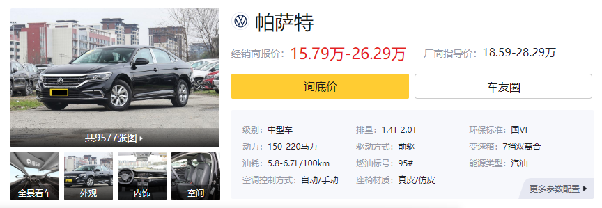 总得来说,虽说帕萨特目前共有8款车型在售,但区分为三个型号,也是很容易选择的。如果仅是针对家用,330TSI尊贵版即可,配置满足,动力充沛,也是最具性价比的一款配置。如果手头预算充足,那就别考虑。相反,如果预算不够,那也是买280TSI精英版,配置用料上要比商务版好很多。不过也一样,如果是用作营运用途,那就必须是280TSI商务版。