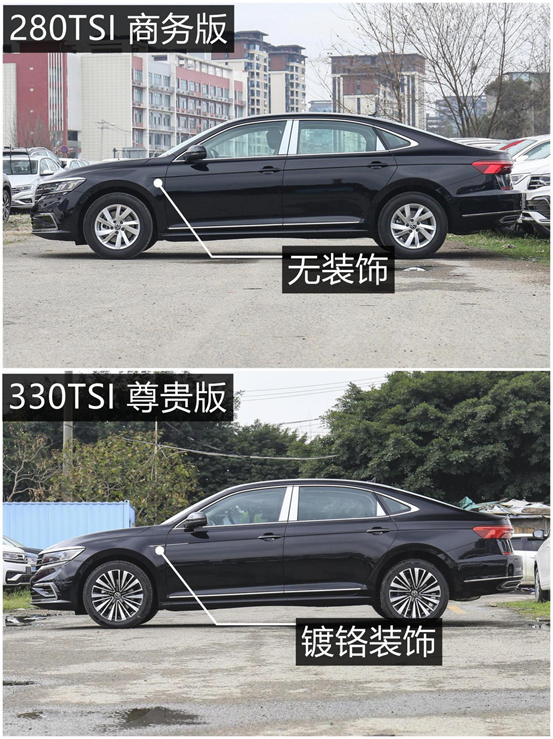 来到侧面,同样全系也都是一个样式,整体造型也是偏向于商务。全系车身尺寸都为4933/1836/1469mm,轴距2871mm,除了轮毂的样式与大小全系有着区别之外,还有一点就是在翼子板处,330TSI豪华版以上所有车型都贴有一个镀铬装饰,而280TSI车型及330TSI精英版车型是没有的。。