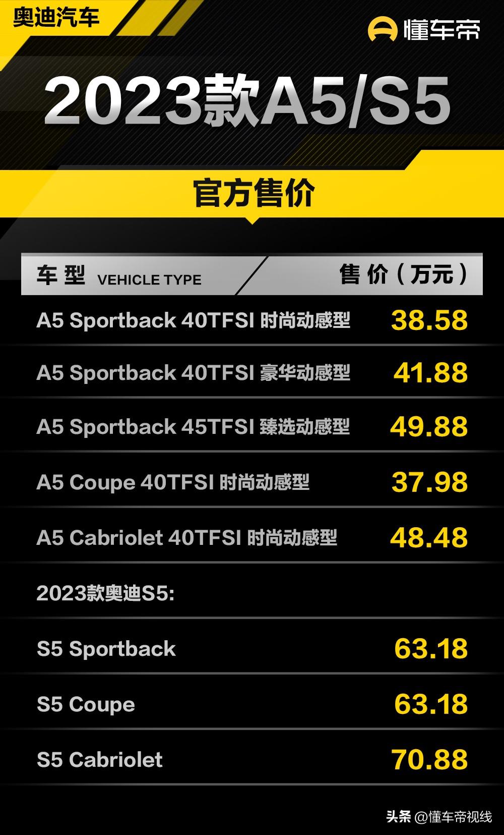 [懂车帝原创 产品] 近日,懂车帝从相关渠道获悉,2023款奥迪A5家族全系车型上市,其中奥迪A5 Sportback四门轿跑车推出3款车型,官方指导价区间为38.58万-49.88万元;奥迪A5 Coupe双门轿跑车推出1款车型,售价为37.98万元;奥迪A5 Cabriolet敞篷车推出1款车型,售价为48.48万元;奥迪S5同样包含四门、双门、敞篷车身,售价区间为63.18万-70.88万元。