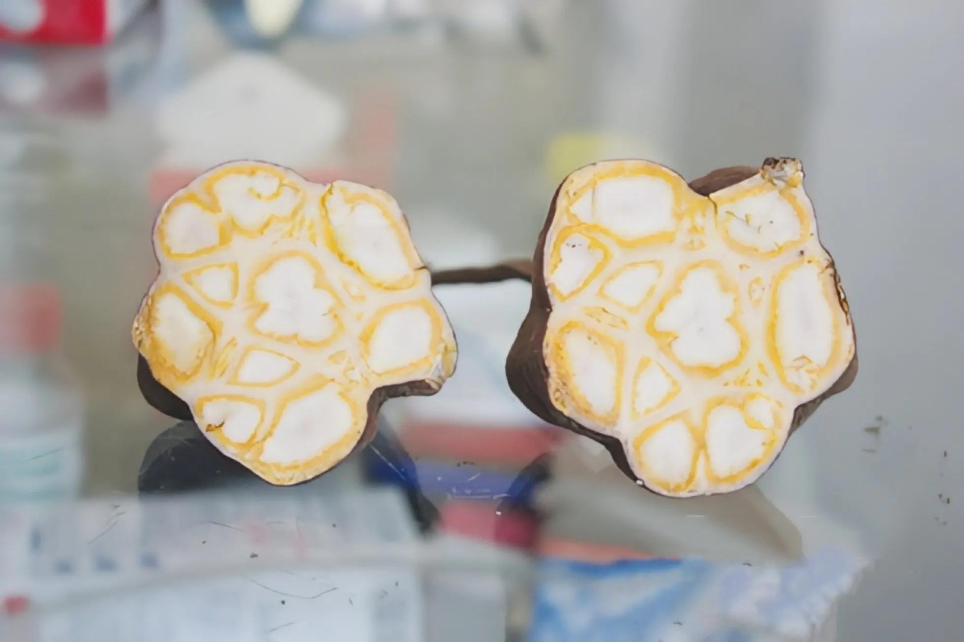 这些何首乌呈暗红色,看起来跟地瓜有点像,但外形没那么规则,从外形以及切开的横断面来看,上面的确显示的是云锦花纹,这的确是野生何首乌无疑了。