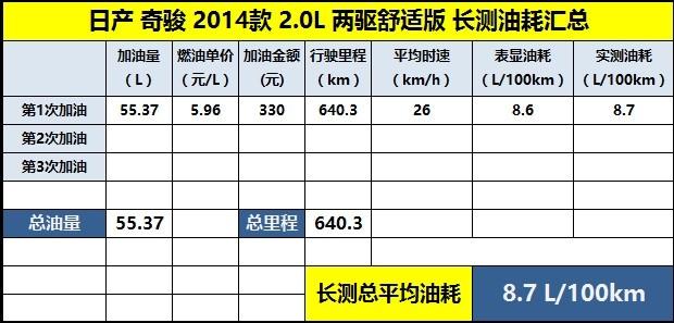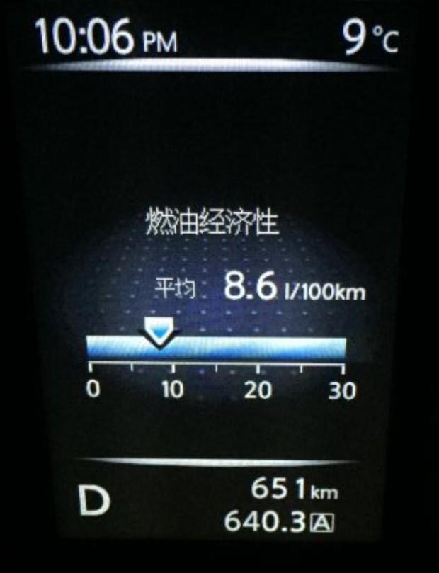 提车至今共加过两次油,第一次就是提车后把油箱加满,到油表灯亮起时共跑了640.3公里,这第二次加的55.37L油,就是这640.3公里所消耗的,算下来100公里的平均油耗是8.7L左右,和电脑上显示的8.6L/100km相差不大,看来电脑还挺准。