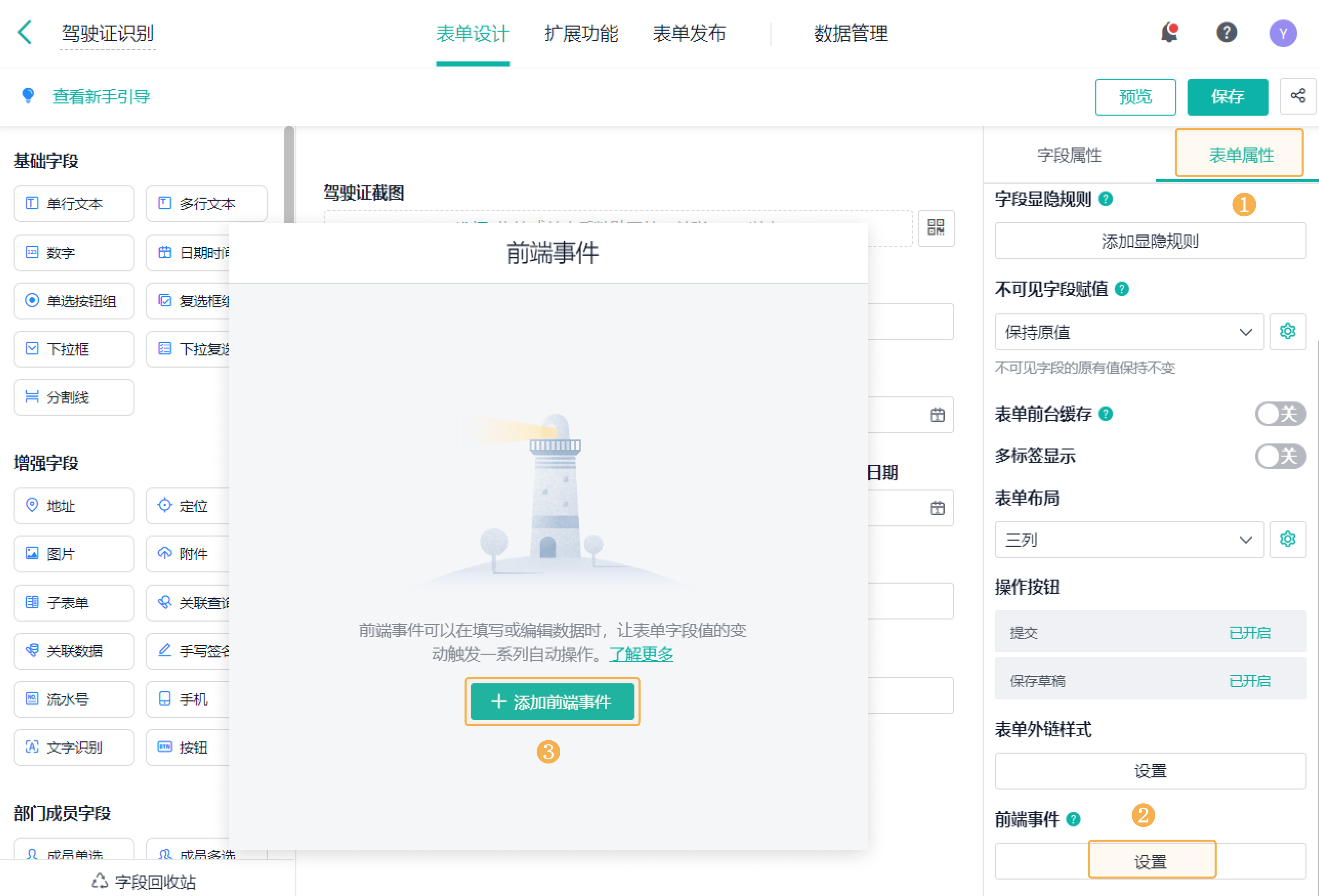 进入「表单属性」,点击前端事件下的设置,添加前端事件: