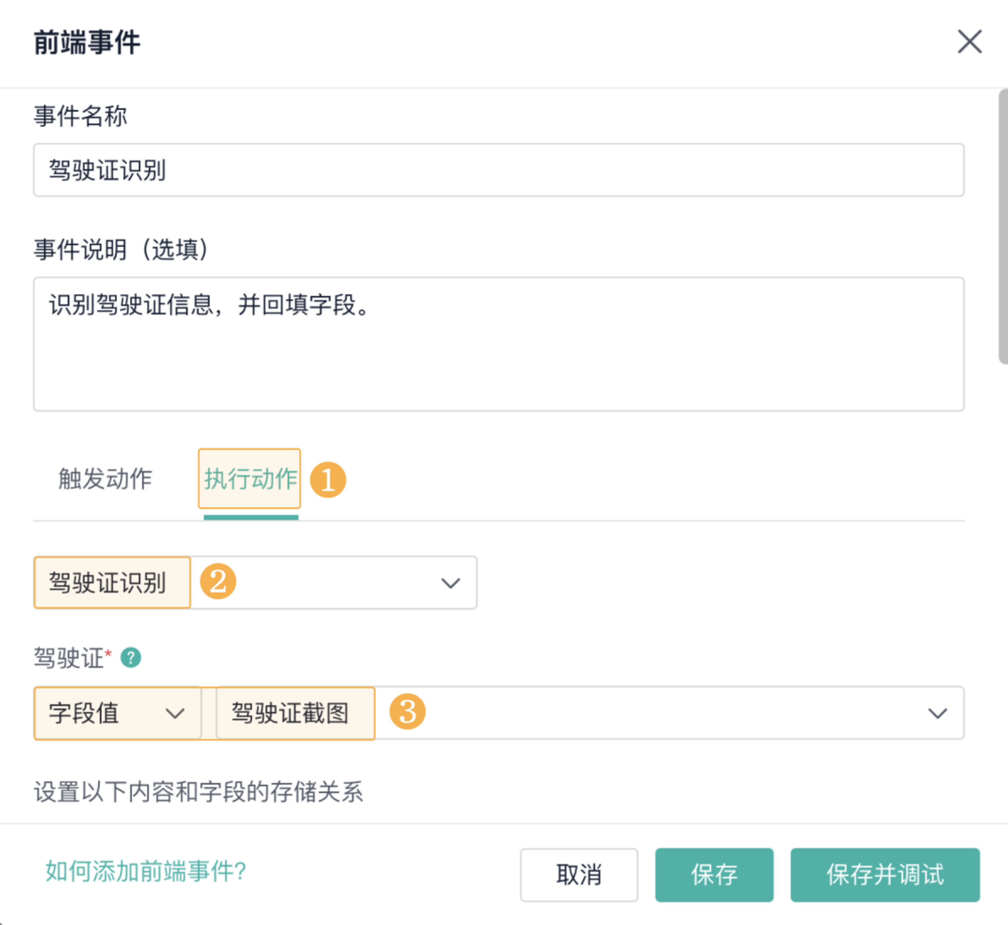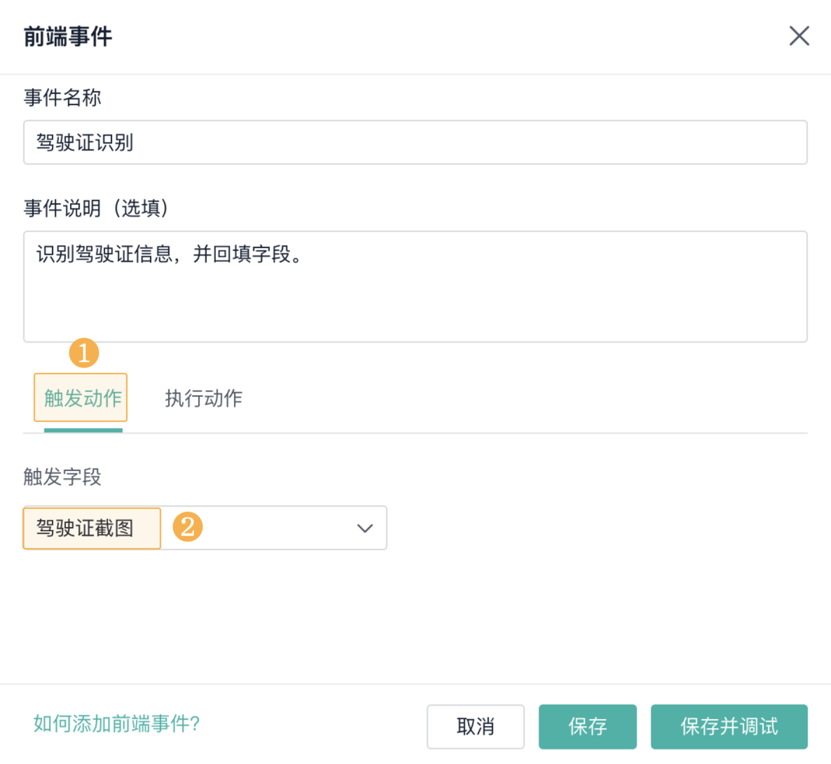 设置触发动作:触发字段选择「驾驶证截图」字段。
