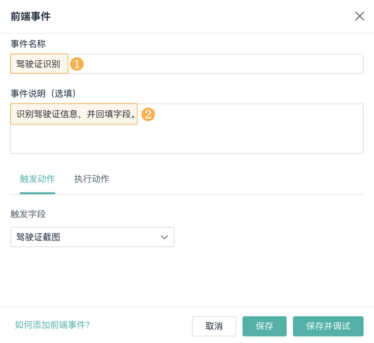 添加好前端事件后,首先设置前端事件的基础信息,即事件名称和事件说明,用于区分前端事件: