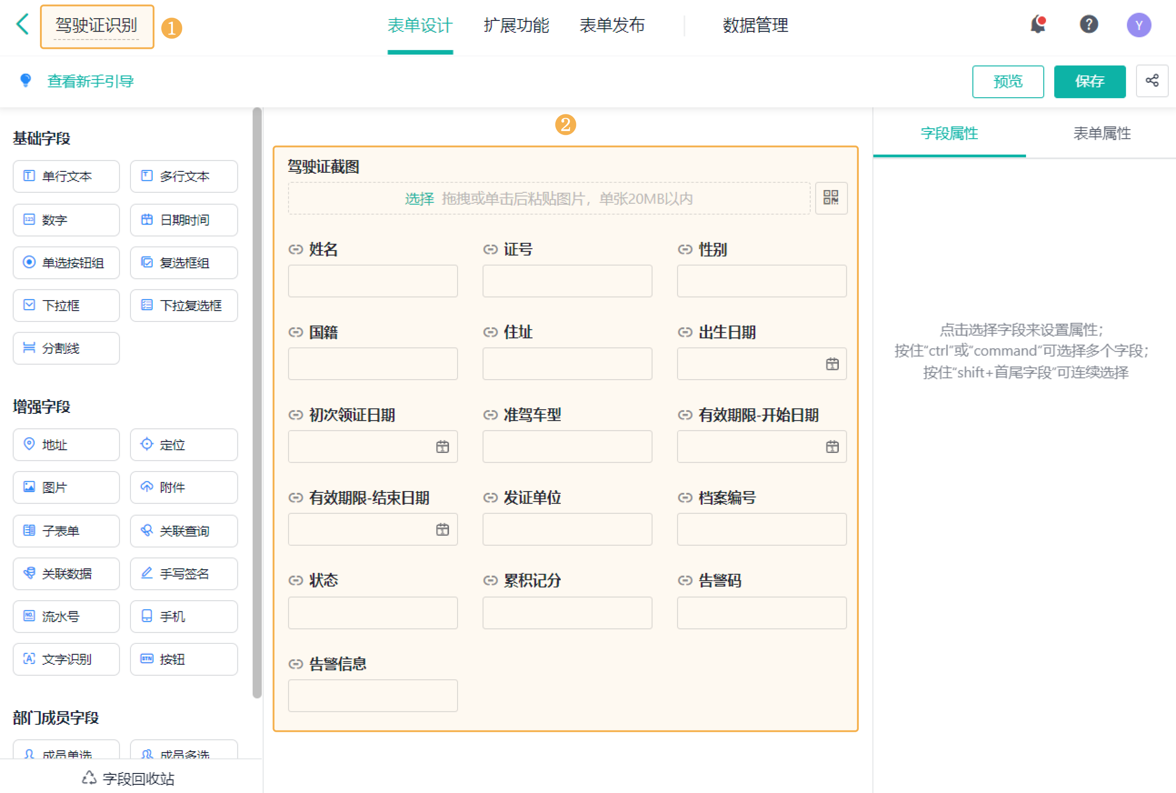 插件使用体验:驾驶证识别插件模板表单。本文将按照示例表单进行讲解。