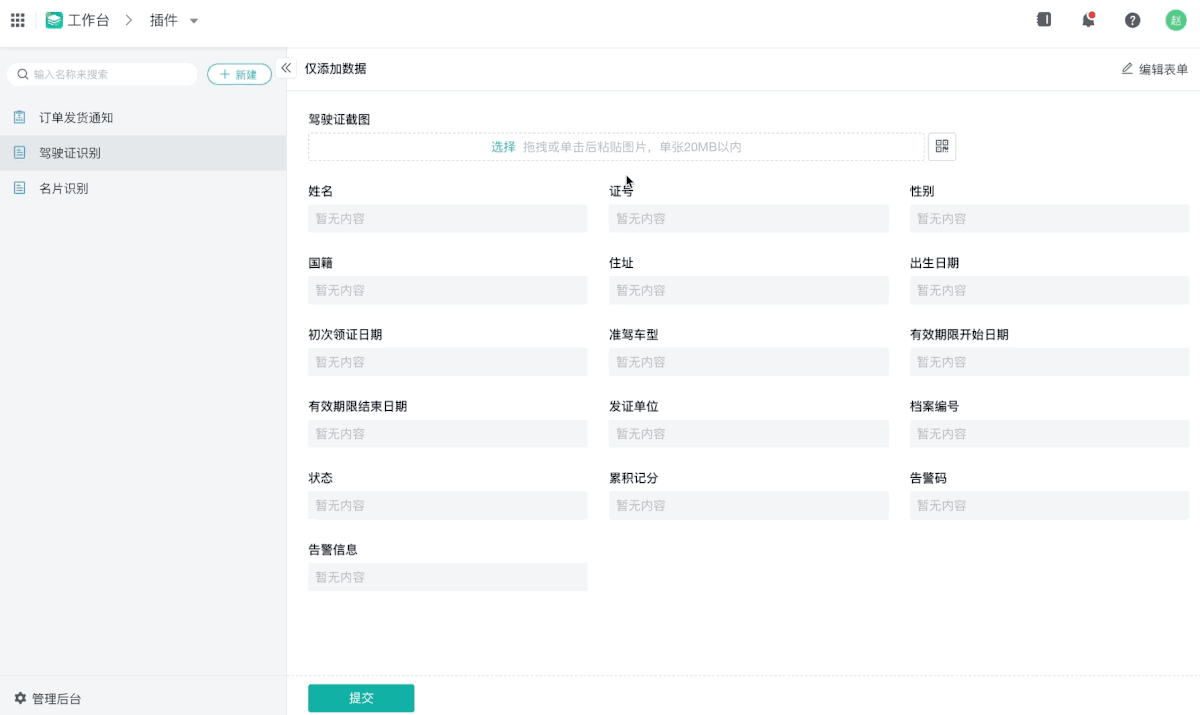 开启驾驶证识别插件,在「驾驶证识别」表单中上传驾驶证截图后,即可自动识别出驾驶证内容,并自动回填至对应字段中,效果如下所示:
