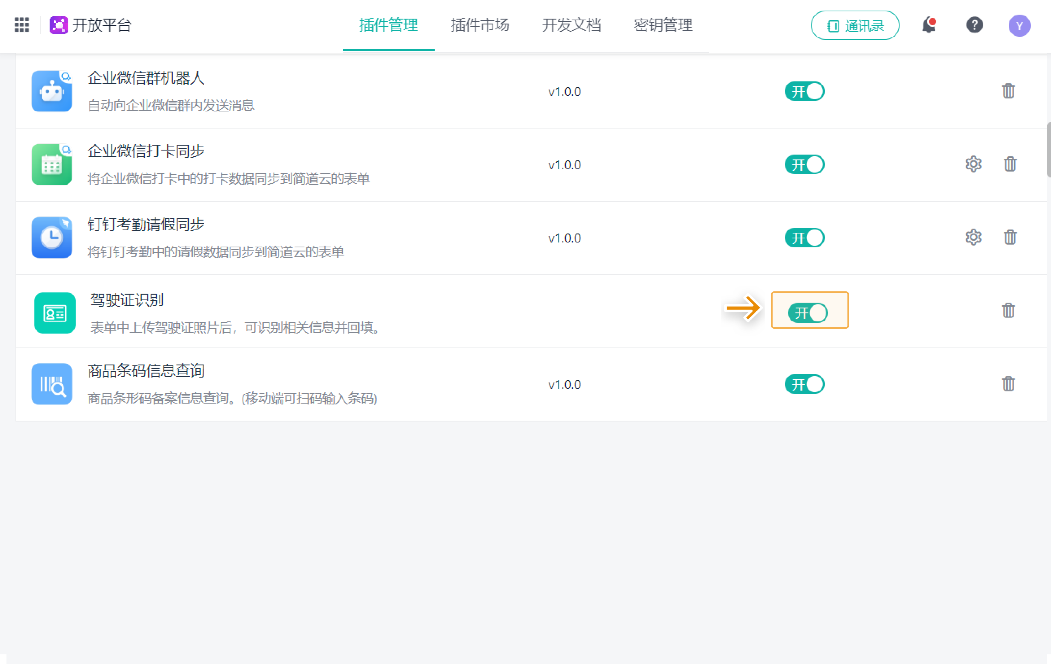 在插件管理中,打开「驾驶证识别」插件右侧开关,启用插件。
