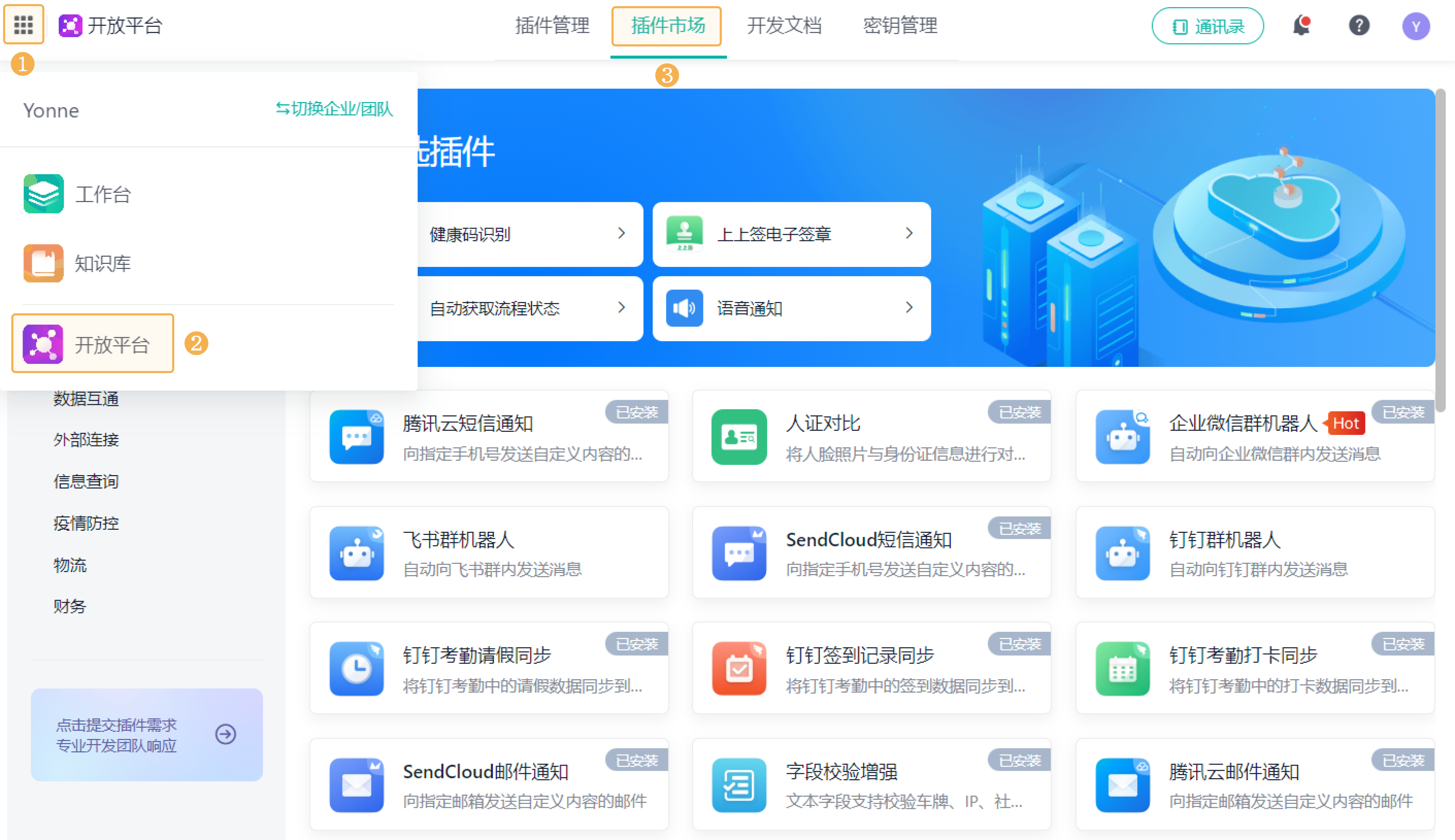 - 安装成功后,可参考本文【2.2 启用插件】,前往 「 开放平台 >> 插件管理 」 处启用插件。