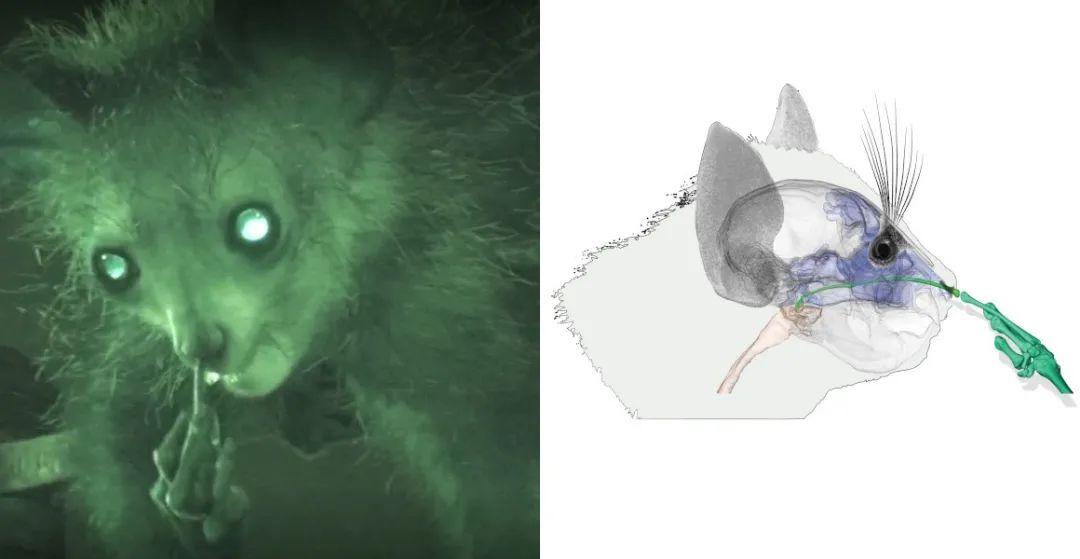 为了搞清楚这个不可思议的行为,研究人员创建了一个3D模型,用指狐猴的头部和手部的 CT扫描来了解中指的去向。