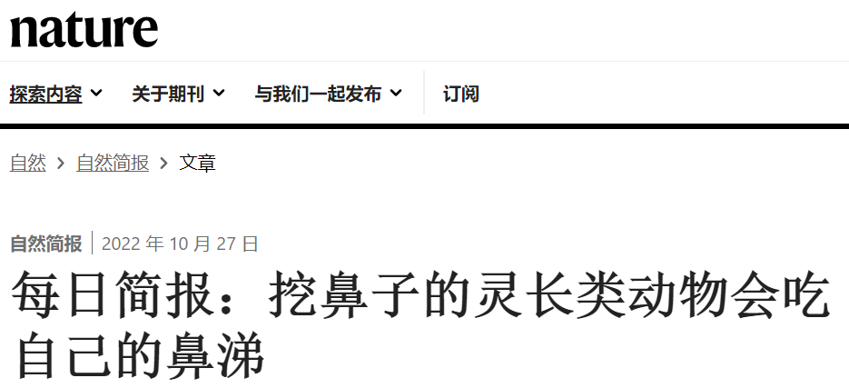 不过有时候也有例外。比如10月27日发布的这篇标题有味道的最新研究:Nose-picking primates eat their own snot( 挖鼻子的灵长类动物会吃自己的鼻涕 )