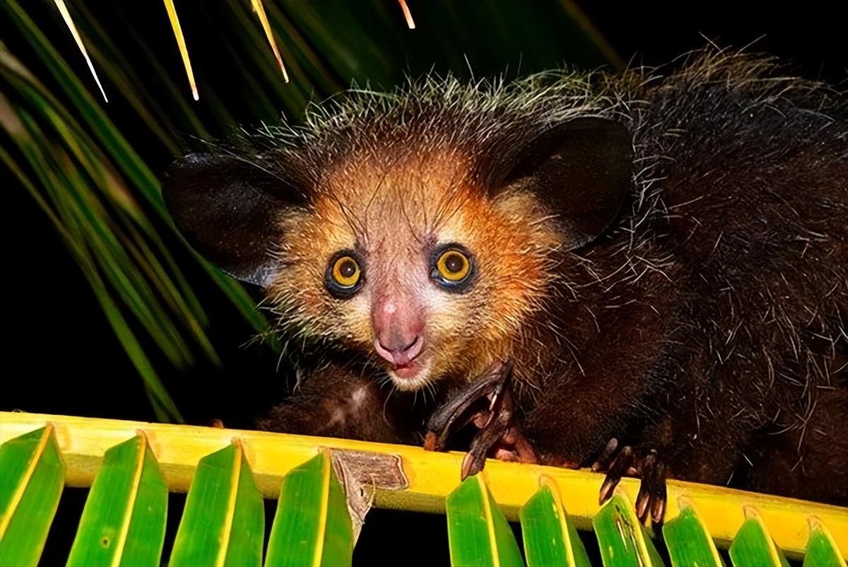 指狐猴,一种英文名非常可爱的狐猴(英文名为Aye Aye,直译为啊耶耶),不过 长相却似乎和可爱沾不上边 ,瞪的像铜铃一样的大眼睛、凌乱的毛发、细长尖锐的爪子、像老鼠一样的尖牙都使得这家伙长得有点吓人。