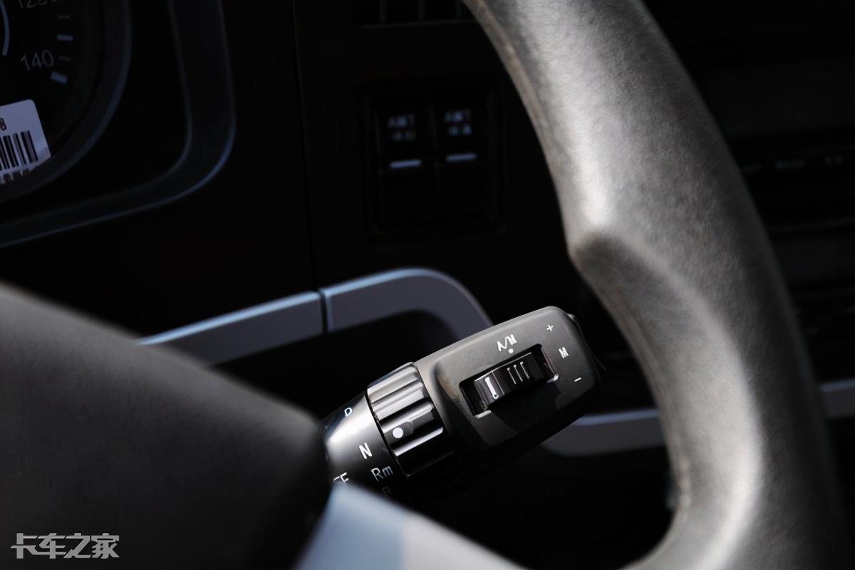车内最大的亮点在于转向柱右侧的拨杆,挡位操作杆和雨刮器开关布置在一起,采用国产卡车产品上比较少见的怀挡设计。怀挡控制开关布置在右侧组合开关上,内侧旋钮可选择D、Dm、N、R、Rm共5个挡位,外侧拨钮可选择自动模式和手动模式,整个拨杆向上推是手动加挡,向下拉是手动减挡。