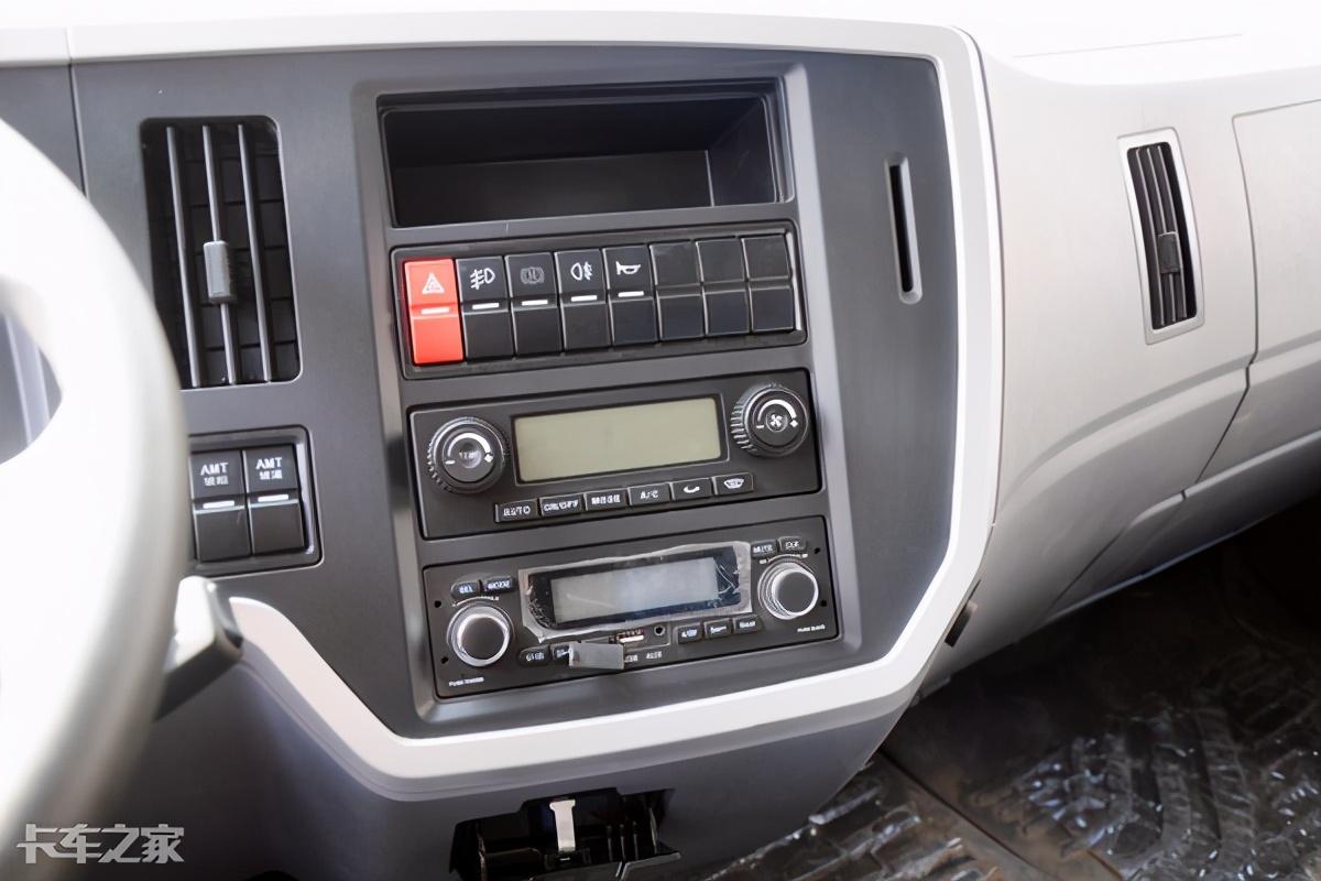 中控区域主要布置有自动空调、收音机、前后雾灯开关、电/气喇叭转换按钮等。中控区域上方的储物槽适合放置手机、计算机等物品。中控区域右侧设计有一个卡槽,方便驾驶员快速取放高速通行卡。
