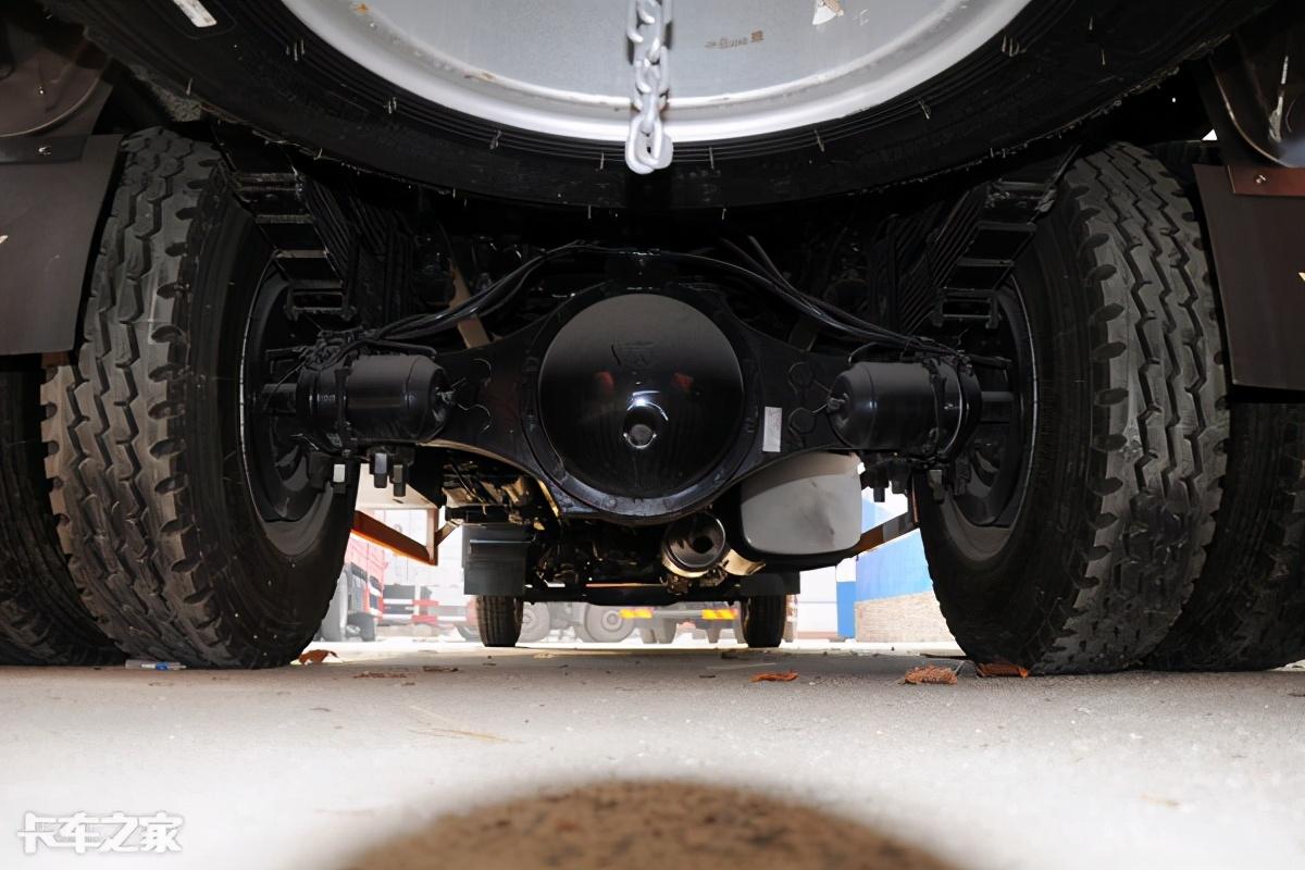 这款龙V采用青特1092型号的后桥,后桥速比为4.875。型号中的第一位数1表示载货汽车,中间两位数09表示自重和允许载重的总重为9吨,第四位数2表示同吨位的不同车型序列。整车采用前7后10+3的多片簧设计,为车辆提供了不错的承载能力。