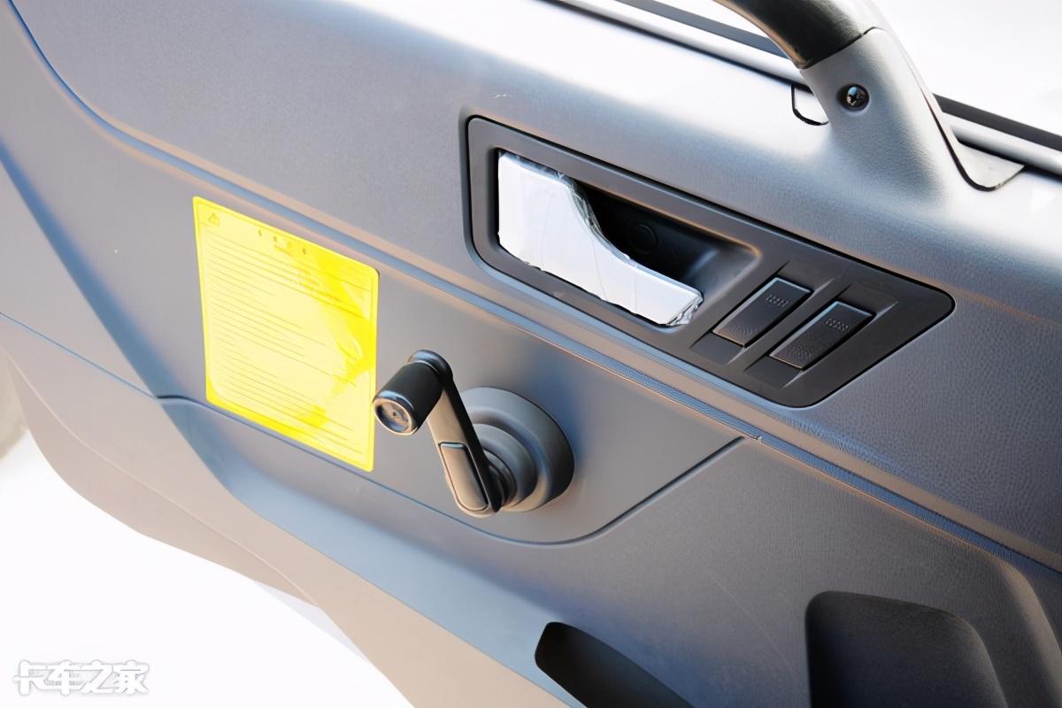 另外一个美中不足的地方在于车窗部分,驾驶室采用手摇车窗的设计,在卡车市场配置越来越高端、设计越来越人性的趋势和背景下,这种设计显得有些落伍。虽然用户可以选装电动车窗,但手摇车窗出现在视野里还是会为驾驶室减分不少。