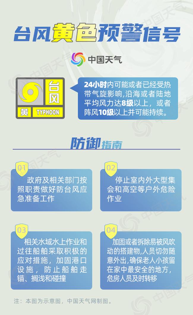 台风黄色预警信号发布意味着24小时内可能或者已经受热带气旋影响,沿海或者陆地平均风力达8级以上,或者阵风10级以上并可能持续。各部门接到预警后要进入防风状态,停止户外大型集会。