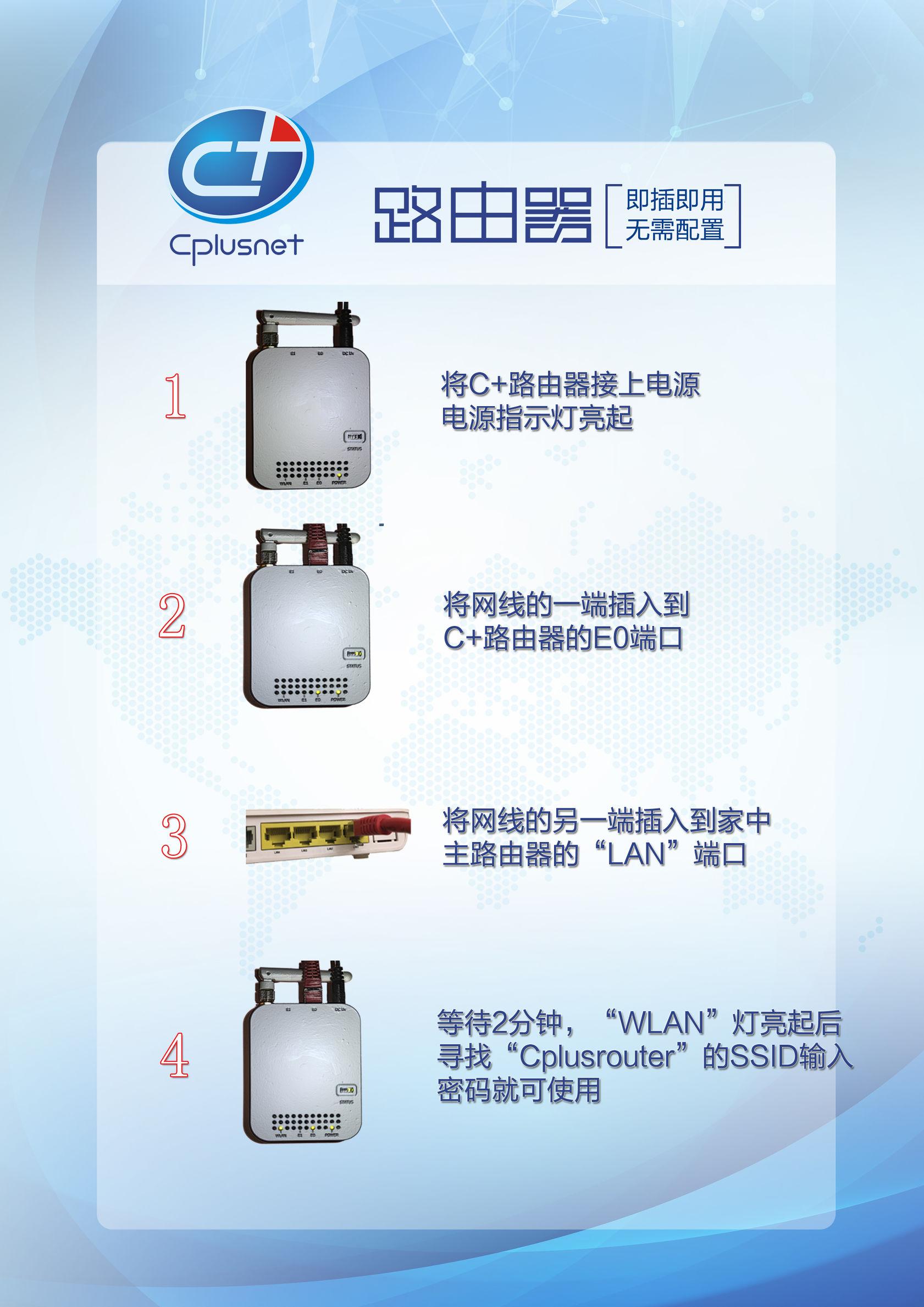 用网线将C+路由器接在主路由器上,然后将电视盒子连接好电视,电视盒子搜索C+路由器的无线信号,或是用网线接在C+路由器的E1口上。