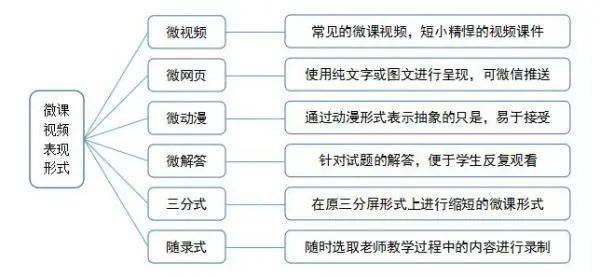 “微课”的核心组成部分是课堂知识的传授过程,在这个过程中所体现的与该教学主题相关的教学设计(微教案——指微课教学活动的简要设计和说明)、素材课件(微课件——指在微课教学过程中所用到的多媒体教学课件等)、教学反思(微反思——指教学活动之后的体会、反思、改进措施等)、练习测试(微习题——根据教学内容而设计的练习测试题目)及学生反馈、教师点评等辅助性教学资源也是微课的组成部分。这些方面共同构成了微课模式的表现形式