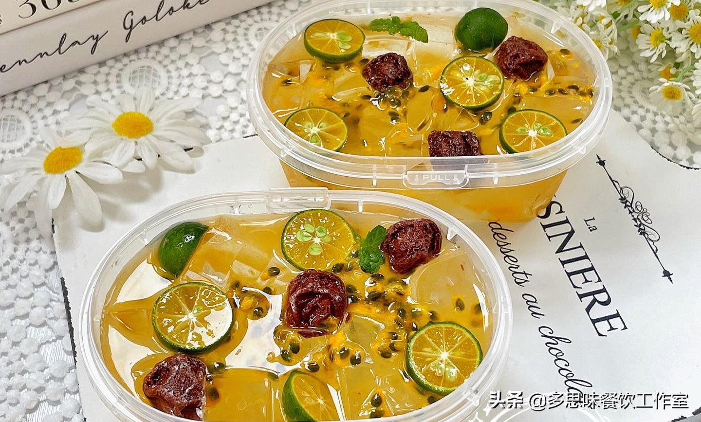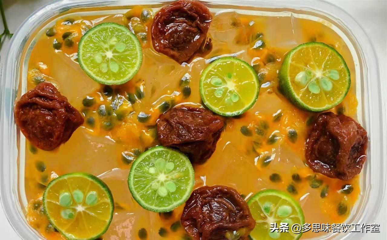 食材:百香果2个,石斛10克,话梅5颗,小青柠4个,白凉粉20克,蜂蜜2勺。