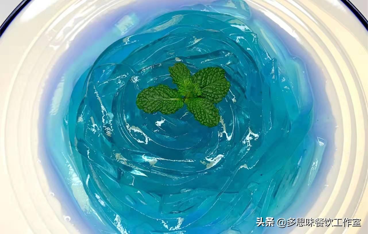 2凝固后切成长条,放入盆中备用,水中加入少量蝶豆花粉、几滴柠檬汁,调至紫晶晶的颜色,倒在水晶冰粉上,再稍微装饰一下更好看哦