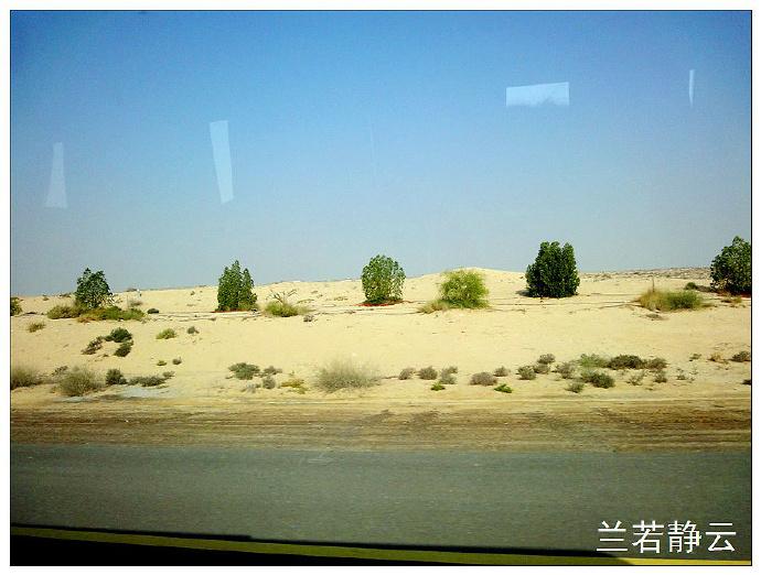 离开迪拜市区后车子行走在高速公路上,沿途可见漫漫黄沙,只有零星的绿色植物。这就是迪拜境内的状况,从这里就可以看得出其中的奥妙来。