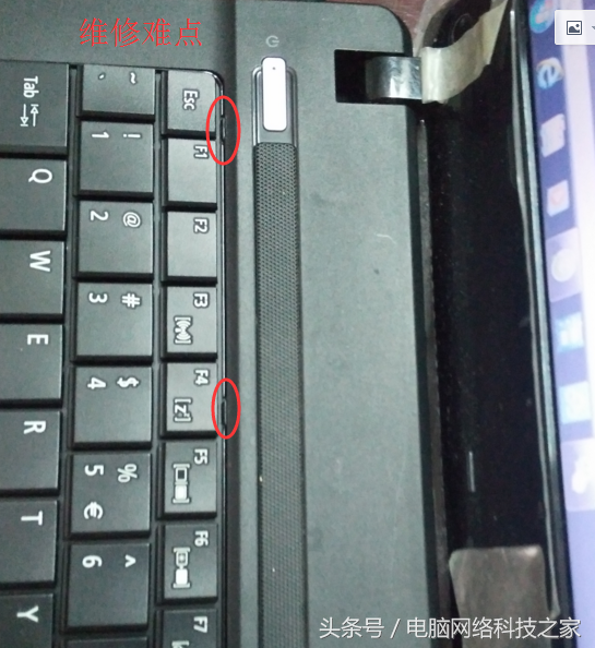 更换主板并没什么难度,让我觉得难度稍大的是拆键盘,这也是我写这篇文章的原因。之所说它难,是因为键盘上下都是通过卡扣(弹簧卡片)扣住的,第一次接触的这种机型的人可能不知道应该撬哪边。事实上,要把它拆下来必须从上面的卡扣入手,如下图,红圈里面的就是上面的卡扣,一共有五个,需先给键盘施加一个向上提的力(可以用刀片),再将卡扣用一字螺丝刀往内压,边压边提,直到释放上面所有的卡扣,键盘就能取出。
