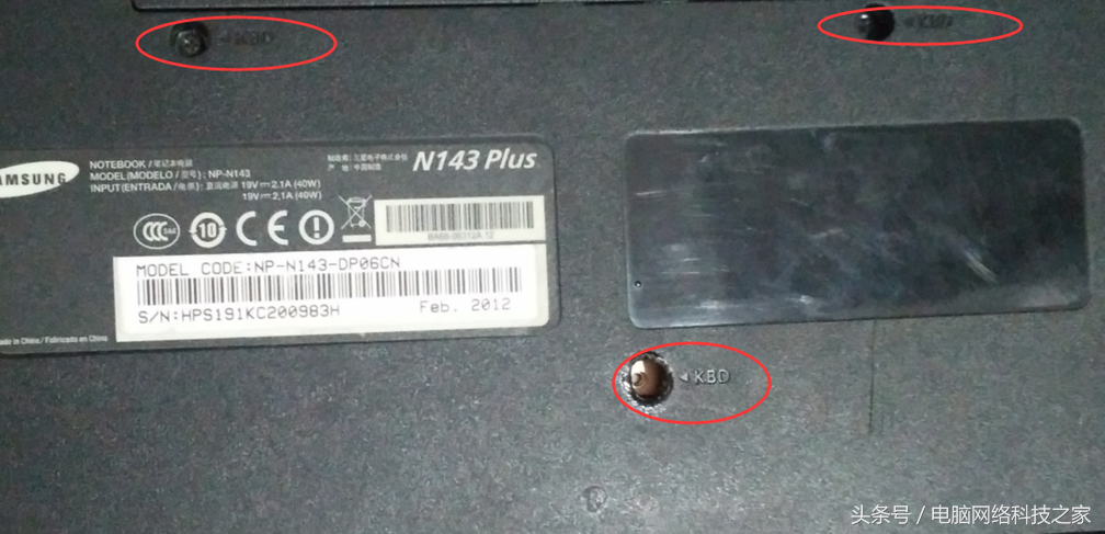 还有一些笔记本的键盘并没有卡扣,而是通过螺丝固定,像下面这台三星N143,在它的背面有三处标记着KBD三个字母,也就是keyboard(键盘的缩写),只要把这三个螺丝拧掉,键盘就可以取出,相比上一种更为简单一些。