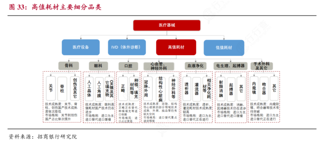 公开资料显示, 高值耗材包括骨科、眼科、心血管、神经外科、口腔、血液净化、电生理、起搏器、手术外科等十多个细分品类 。各赛道国内产品技术发展阶段、进口替代情况等存在较大差异。