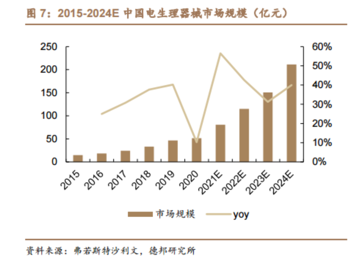 值得一提的是,2020年我国电生理市场规模达51.5亿元,2015-2020年CAGR为28.3%。 根据弗若斯特沙利文的预测,2020-2024年我国电生理器械市场仍将高速增长,CAGR高达42.3% 。