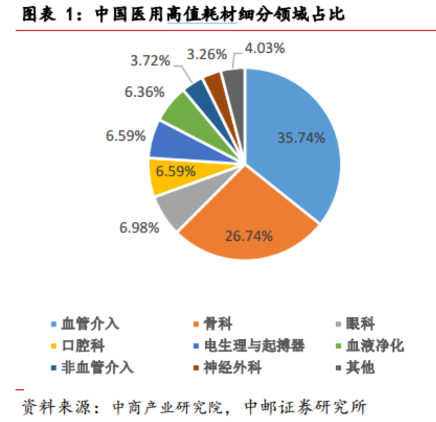 中邮证券周豫等研报中表示,从细分市场情况来看,2019年骨科植入耗材规模345亿元,血管介入耗材461亿元,神经外科耗材42亿元,眼科耗材90亿元,口腔科耗材85亿元,血液净化耗材82亿元,非血管介入耗材48亿元,电生理与起搏器85亿元,其他52亿元。