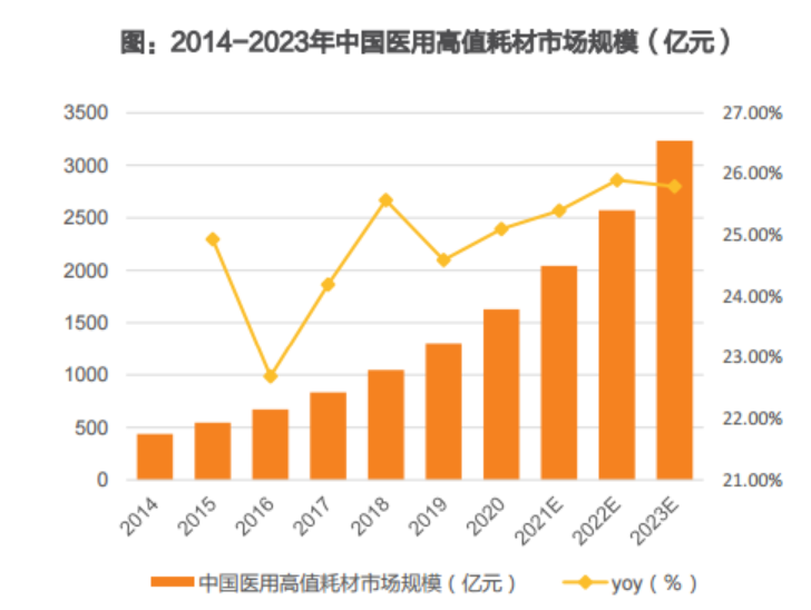 天风证券杨松等在11月5日研报中预计, 2022年末中国医用高值耗材市场规模将超过2500亿元 。