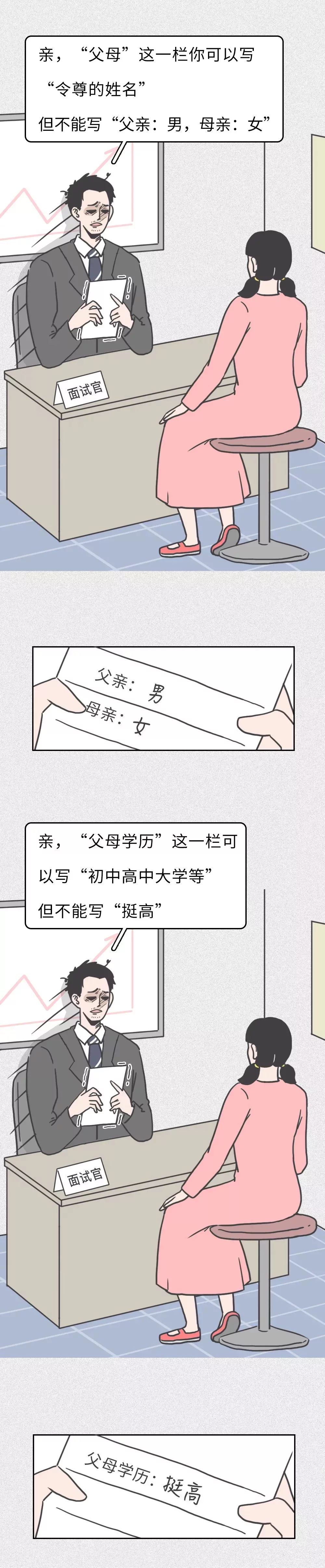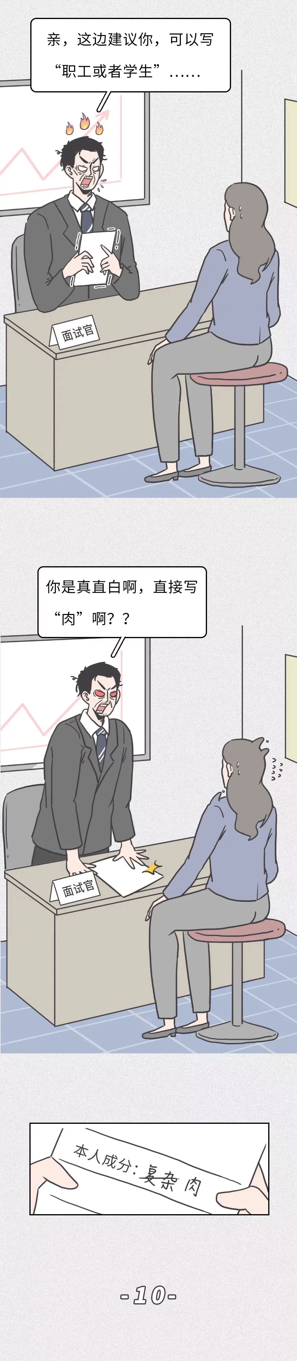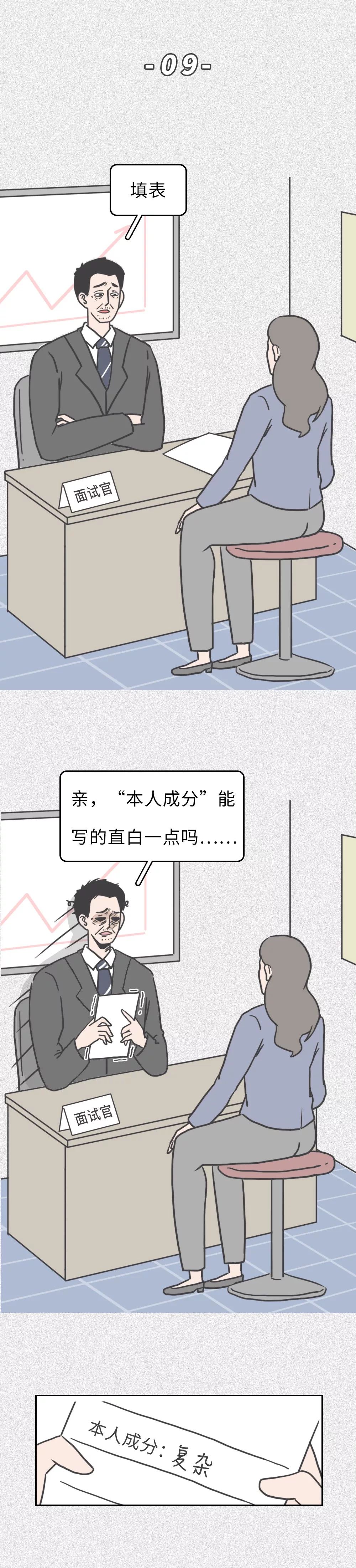 又到毕业季啦!HR们最头疼焦虑的时候到了!坐在写字楼里,吹吹空调,看看电脑,选选简历,跟人打打交道……你以为hr的工作这么轻松吗?对于他们来说,痛苦的其实不全是日常的闲碎工作,而是和各种各样的选手打交道,应对他们的各种突发状况和奇葩脑洞。简简单单的一项填表,就能被他们玩出花来。其中出错率比较高的选项有: 本人成分 :可填“职工”或“学生”。请不要填“肉”“水”“碳酸饮料”。 奖惩记录 :可填“无”或“何时何地得过什么奖项”。请填写官方认证过的奖项,类似“一元夺宝中获得阿萨姆”“口红机里面获得过口红”这种奖项,你自己偷着乐就可以了,没必要告诉HR。 政治面貌 :常见有“党员/共青团员/群众/……”。请不要填“非酋”“浓眉大眼”“祖国的花朵”“平民”“长脸”“圆脸”,放过HR吧!他还只是个孩子啊!希望各位小可爱去面试前,基本的功课还是要做一做的。虽然机灵活泼是好事,但也不!能!这!么!皮!啊!每一行都不容易!多一点理解配合!世界会变得更美好!