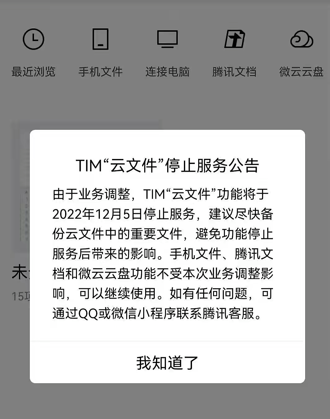 近日,腾讯 TIM 团队在 App 内发布公告称:由于业务调整,TIM「云文件」功能将于 2022 年 12 月 5 日停止服务,建议尽快备份云文件中的重要文件,避免功能停止后带来的功能。