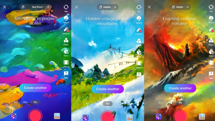 点击这个选项,然后在屏幕中间的对话框里输入一段文字描述,只用不到5秒的时间,TikTok 就可以根据文字描述生成一张竖版画作,用作短视频的背景: