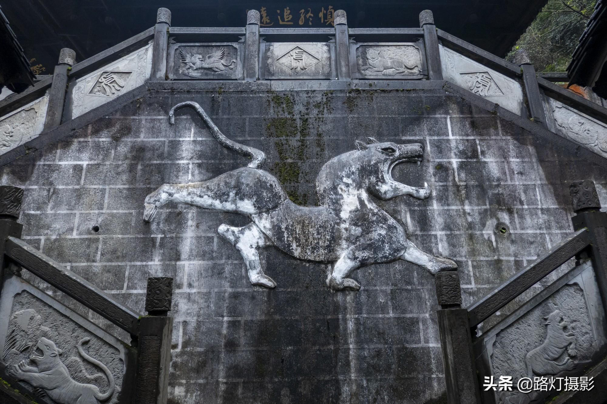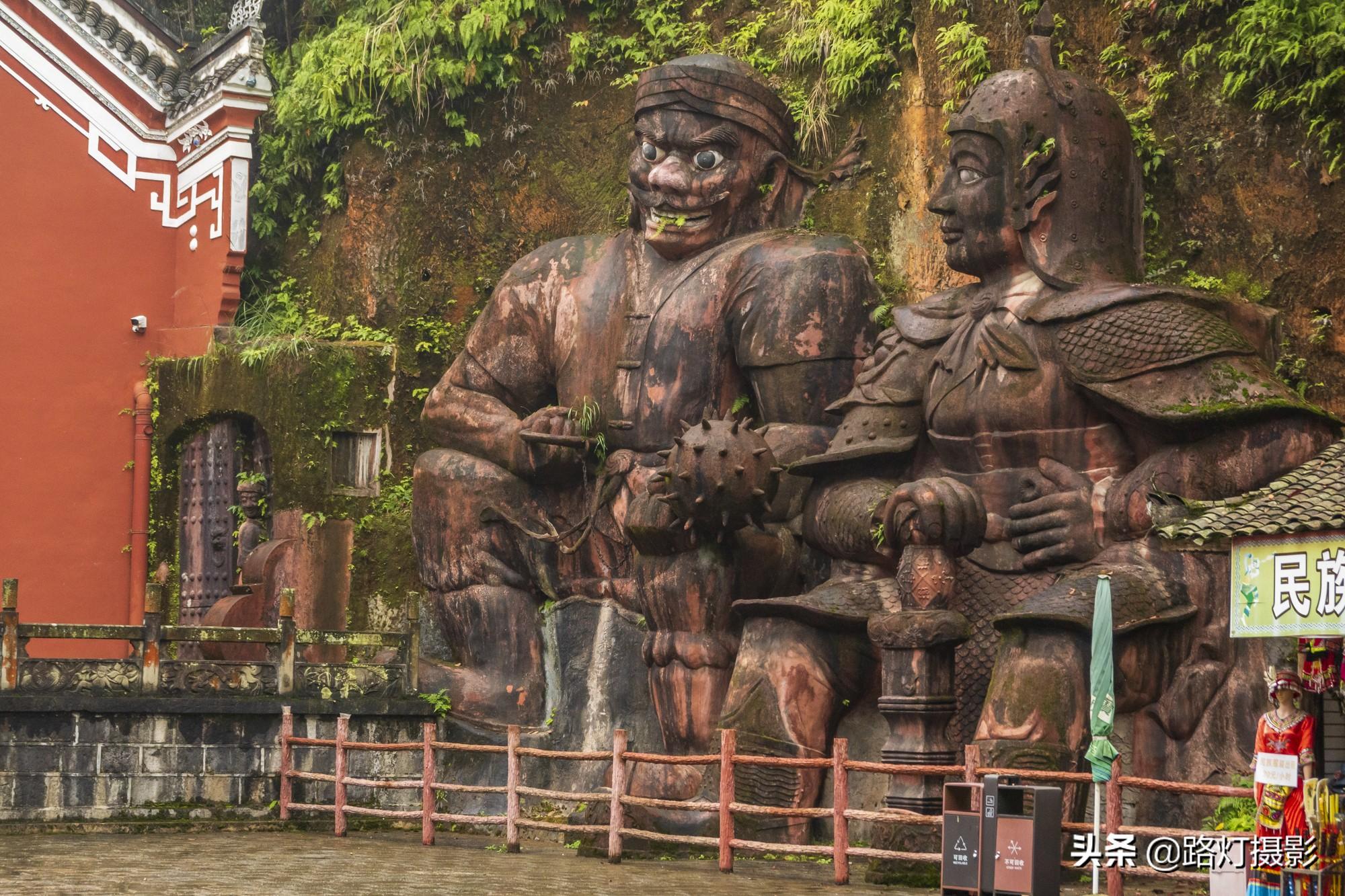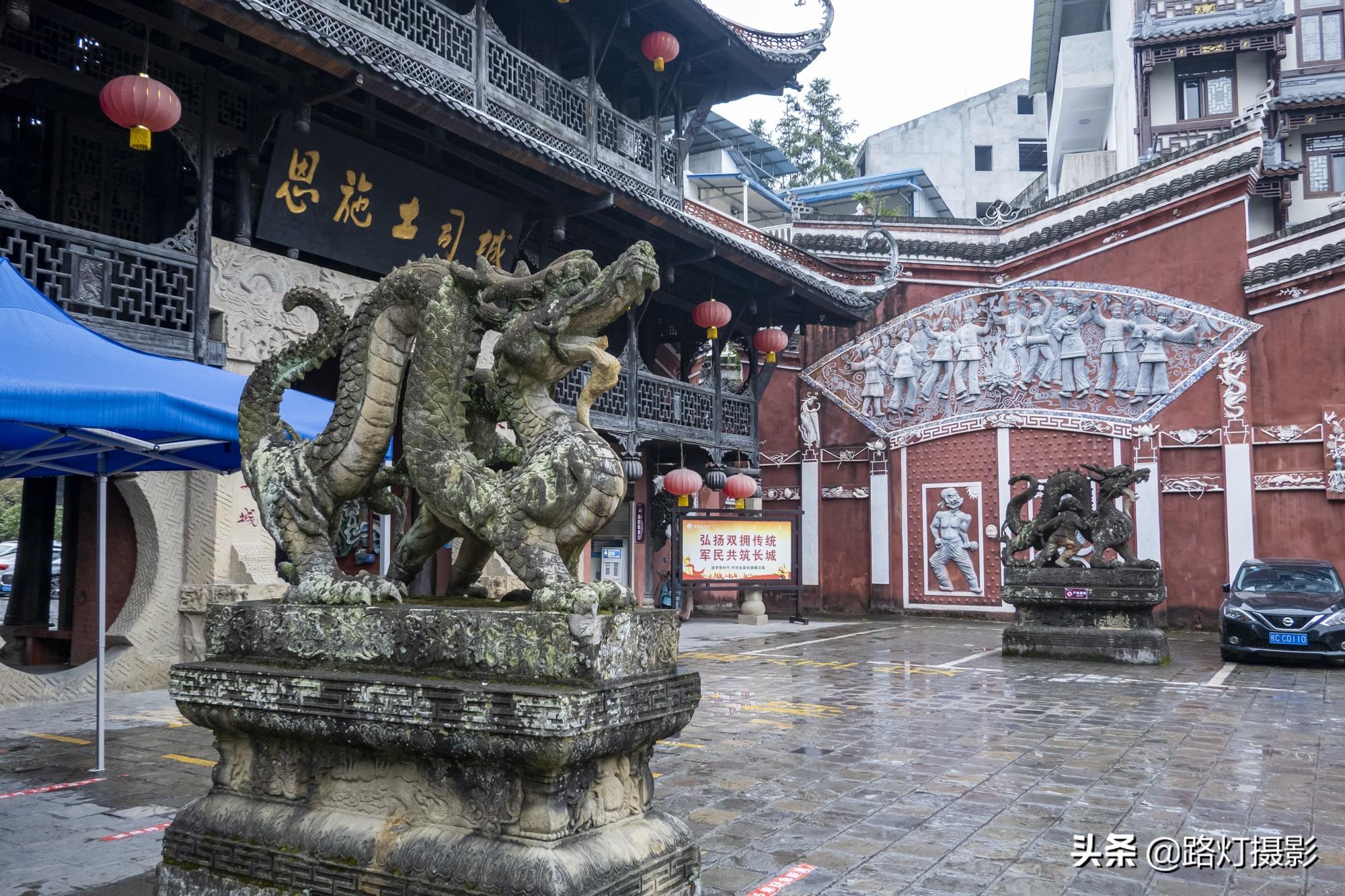 穿过土司城门楼就进入了土司城,这座门口共四层,虽然色调低沉,但是建筑宏大,形式还算华丽,门楼上有神像、金龙和土家族信奉的神像等各种雕塑,还有两条金龙分立两侧,显得威武霸气。