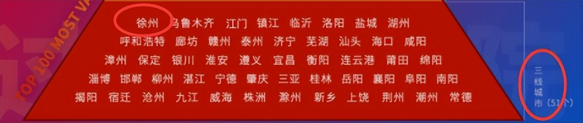在这份榜单中,可以发现,徐州被划为三线城市,位居金字塔的第四梯队城市行列。