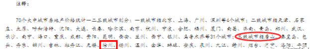 在国家统计局, 2022年3月份发布的《 国家统计局城市司首席统计师绳国庆解读2022年3月份商品住宅销售价格变动情况统计数据 》一文中,对全国70个大中城市进行了一二三线划分,其中, 徐州被划为三线城市,位居第三梯队。