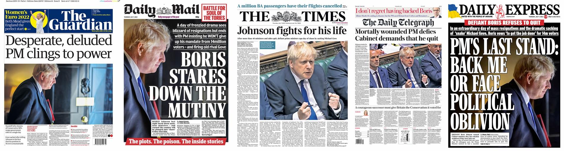 约翰逊的前东家《每日电讯报》称,这场“势不可挡的叛乱”(overwhelming mutiny)已经为约翰逊造成了“致命伤害”(mortally wounded)。《每日快讯》也认为,约翰逊已经到了“背水一战”(last stand)的时刻,《泰晤士报》则形容约翰逊现在是在“为生存而战”(fights for his life)。