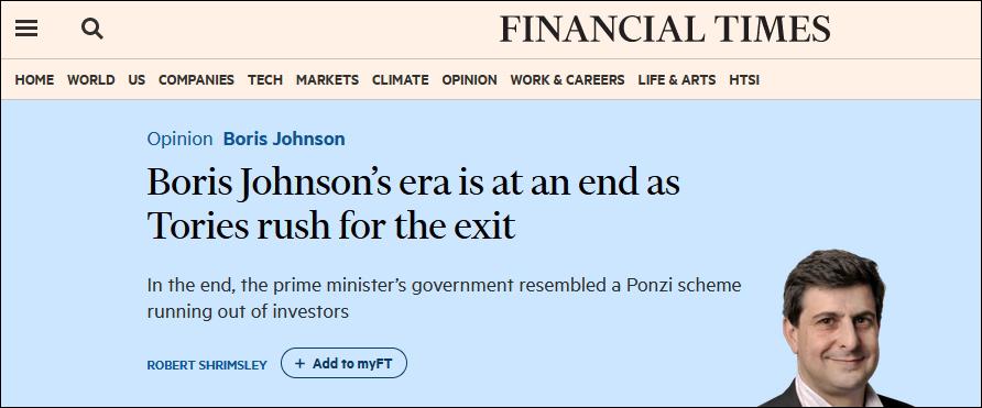 英国《金融时报》的刊发该报前首席政治记者罗伯特·施里姆斯利(Robert Shrimsley)评论称,这场始于卫生大臣和财政大臣的辞职风波已经引发了一场“不可阻挡的洪流”,目前唯一没有答案的问题是约翰逊会如何退出。
