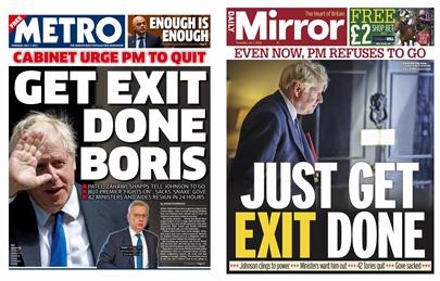 “绝望、自欺欺人”(desperate,deluded),这是偏左翼的《卫报》对于留恋权力的约翰逊现状的描述。《每日镜报》和《地铁报》的标题更是直接借用了约翰逊当初的脱欧口号“搞定脱欧”(Get Brexit done),喊话约翰逊:搞定下台(Get exit done)!