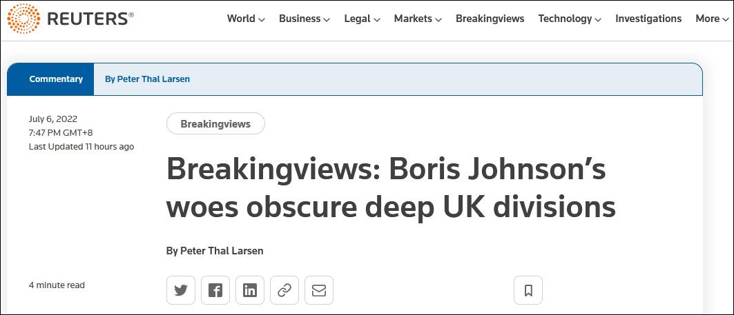 英国路透社“热点透视”专栏文章则认为,约翰逊的“末日”即将来临,他对于权力的控制力也正在下滑,但在政府“叛乱闹剧”的背后,隐藏着更深的国家分歧,而驱逐约翰逊只会突出这些矛盾。